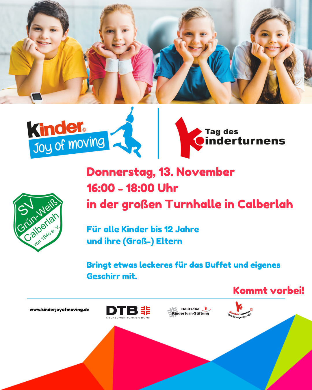 Herzliche EINLADUNG zum Tag des Kinderturnens am Donnerstag, 13.11. von 16-18:00 Uhr in der großen Turnhalle Calberlah mit Mitbringbuffet.